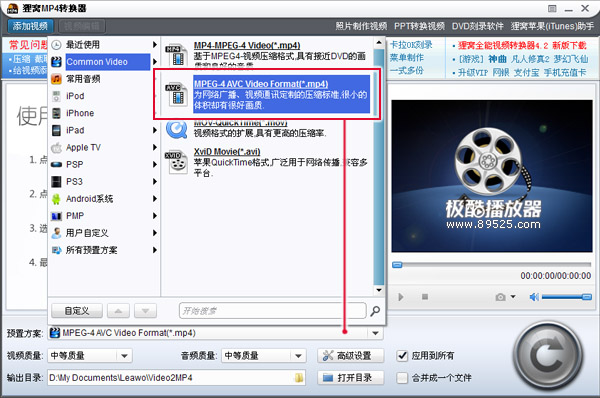- 狸窝mp4格式视频转换器是一款功能强大的MP4视频转换器,它可以将几乎所有流行的视频格式。如:RM、RMVB、VOB、DAT、VCD、DVD、 SVCD、ASF、MOV、QT、MPEG、WMV、MP4、3GP、DivX、XviD、AVI等视频文件转换为MP4机、智能手机、Apple iPod所支持的视频格式。